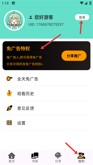 4、點(diǎn)擊我的可進(jìn)行登錄后能享受免廣告特權(quán),還能查看觀看歷史進(jìn)行意見反饋和設(shè)置相關(guān)功能。