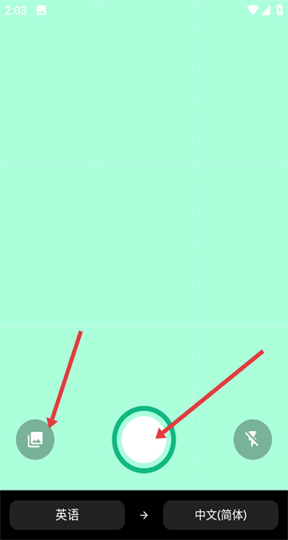 4、圖片翻譯模式下點左側圖標選圖中間按鈕拍攝,完成后按設定語言翻譯即可實現(xiàn)圖片文字迅速轉譯。
