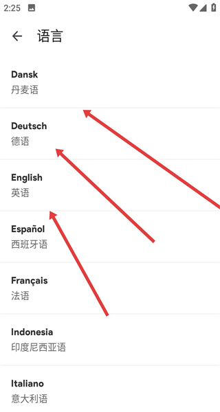 4、語言頁面有丹麥語德語等多種語言可供挑選,選好目標(biāo)語言如德語返回后APP界面語言更新,讓使用更貼合語言偏好提升體驗。