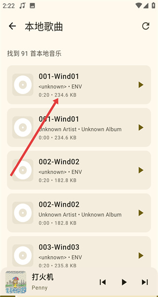 3、權(quán)限授予后,軟件會掃描本地音樂文件,在顯示的本地歌曲列表,找到想要收聽的歌曲。