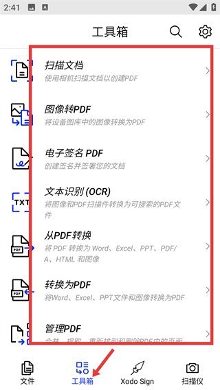 2、進(jìn)入工具箱有掃描文檔,圖像轉(zhuǎn)PDF等多種功能,可根據(jù)需求選擇實(shí)現(xiàn)文檔的掃描格式轉(zhuǎn)換等操作處理各類文件。