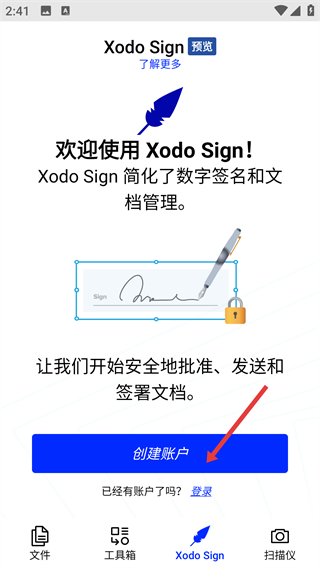 4、進(jìn)入XodoSign可創(chuàng)建賬戶或登錄借助該功能能安全地批準(zhǔn),發(fā)送和簽署文檔,簡(jiǎn)化數(shù)字簽名與文檔管理流程。