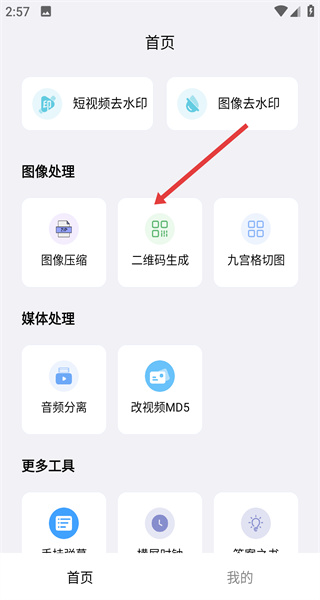 1、打開軟件,在首頁的圖像處理板塊,找到二維碼生成選項,點擊該選項,進入二維碼生成頁面。