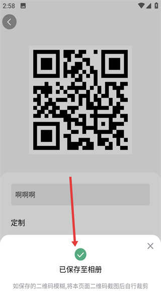4、等待片刻,頁面會提示已保存至相冊,此時生成的二維碼已成功保存到設備相冊中。