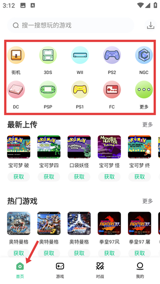 1、在首頁有街機(jī),3DS等多種游戲類型分類還有最新上傳和熱門游戲板塊,可直接挑選感興趣的游戲也能通過搜索欄查找。