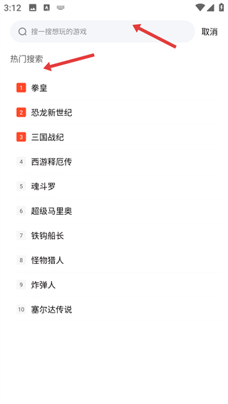 2、進(jìn)入搜索頁面可在搜索欄輸入想玩的游戲,也能查看熱門搜索榜單從榜單里選擇熱門游戲快速找到想玩的。