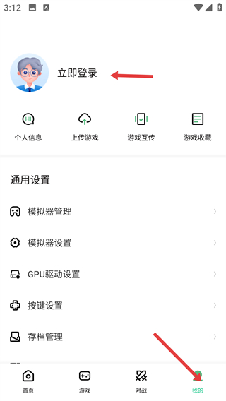 4、點(diǎn)擊我的可進(jìn)行登錄后能查看個(gè)人信息上傳游戲進(jìn)行游戲互傳,還能管理游戲收藏和進(jìn)行各類設(shè)置。