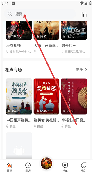 1、進(jìn)入APP首頁找到頂部搜索欄點(diǎn)擊可激活搜索功能,輸入想聽內(nèi)容關(guān)鍵詞快速查找需要的書籍。