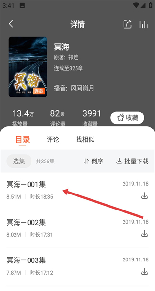 3、搜索找到想聽的冥海書籍音頻后,進(jìn)入詳情頁在目錄里選擇冥海001集即可開始播放首集內(nèi)容,或挑選其他集數(shù)收聽。