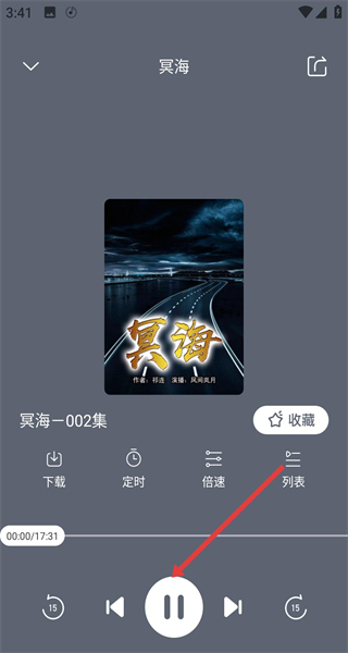 4、播放冥海音頻時點(diǎn)擊播放界面列表正中間的按鈕,能隨時暫停播放音頻,點(diǎn)擊列表能查看音頻集數(shù)方便切換集數(shù)收聽。