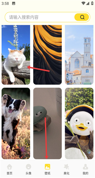 4、切換到底部壁紙導(dǎo)航欄瀏覽豐富壁紙素材或搜索點(diǎn)擊心儀壁紙,可查看詳情并進(jìn)行下載設(shè)置收藏等操作。