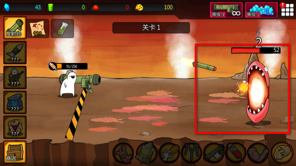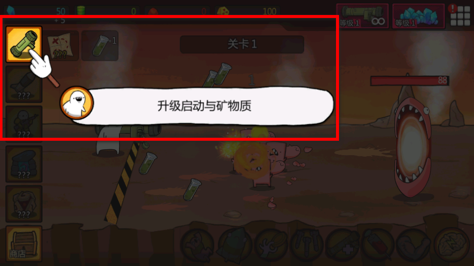 1、進(jìn)入關(guān)卡1,點擊左側(cè)發(fā)射臺,能發(fā)射炮彈攻擊怪物,還可利用礦物質(zhì)升級發(fā)射臺,讓炮彈威力更強,更輕松擊退怪物。