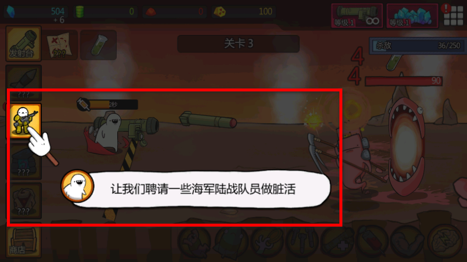4、還能聘請海軍陸戰(zhàn)隊員幫忙作戰(zhàn),他們會用武器攻擊怪物,和發(fā)射臺的炮彈配合,能更高效地消滅怪物,推進(jìn)關(guān)卡進(jìn)程。