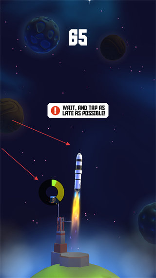 2、點(diǎn)擊屏幕發(fā)射火箭,上方提示W(wǎng)AITAND TAP AS LATE AS POSSIBLE,玩家可關(guān)注圖標(biāo)標(biāo)記的去擊屏幕,以獲取最佳發(fā)射效果。
