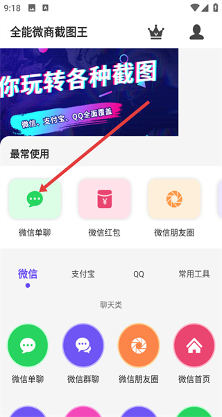 1、打開軟件后,在最常使用區(qū)域找到微信單聊選項(xiàng),點(diǎn)擊進(jìn)入微信單聊界面。