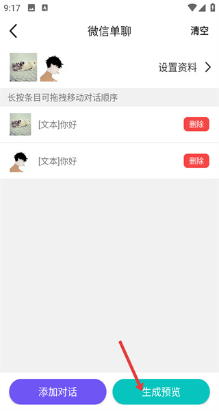 4、添加好對(duì)話內(nèi)容后,點(diǎn)擊界面下方的生成預(yù)覽按鈕,即可查看生成的微信單聊預(yù)覽效果。