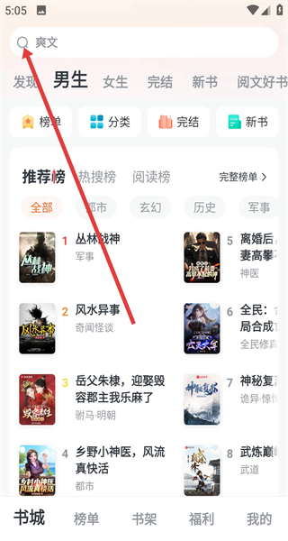 1、進入書城界面點擊頂部放大鏡圖標的搜索欄,即可開啟小說查找之旅快速定位自己心儀的小說內容。