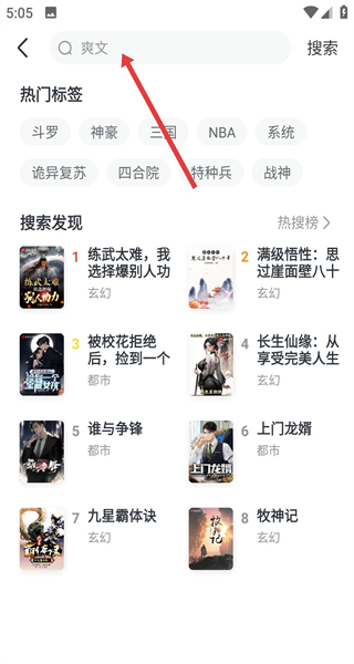 2、在搜索結果頁確認搜索欄爽文系統(tǒng)等關鍵詞精準查找想看的小說,也可瀏覽熱門標簽與搜索發(fā)現(xiàn)按需篩選想看的小說類型。