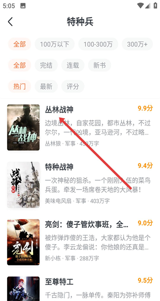 3、從熱門標簽選特種兵進入分類頁,瀏覽榜單依據(jù)評分和字數(shù)以及完結情況挑選如叢林戰(zhàn)神的特種兵題材小說。