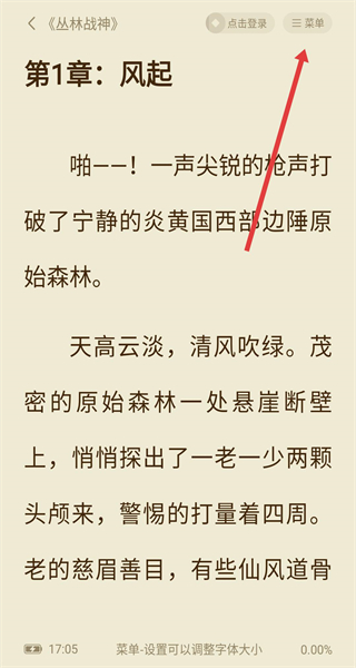 4、打開小說閱讀頁點擊右上角菜單按鈕,即可進行登錄設置字體大小等操作優(yōu)化用戶的小說閱讀體驗。