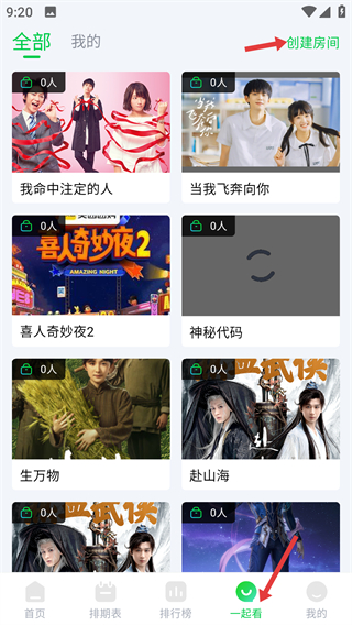 4、進入一起看可看到全部影視房間能創(chuàng)建房間,和他人一起觀看影視還能選擇感興趣的房間加入共享觀影樂趣。