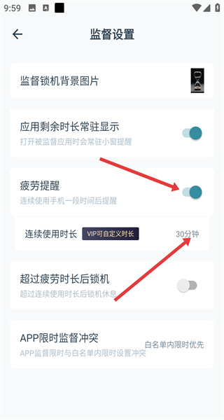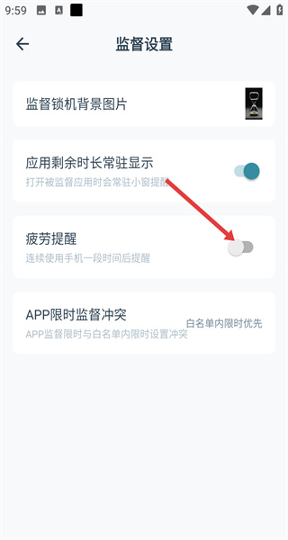 3、在監(jiān)督設(shè)置頁(yè)面,找到疲勞提醒選項(xiàng),點(diǎn)擊其右側(cè)的開關(guān)按鈕將其開啟。
