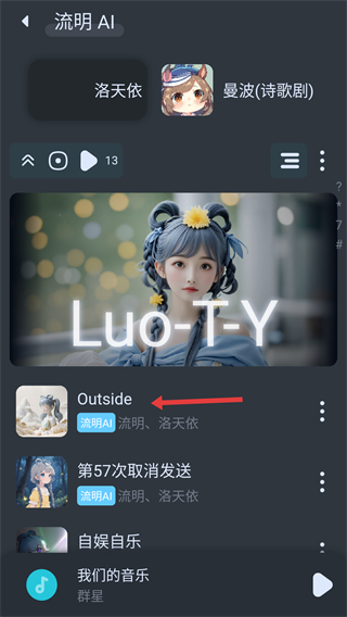 2、進(jìn)入流明頁面能看到洛天依,曼波等相關(guān)內(nèi)容還有歌曲列表,可選擇喜歡的歌曲進(jìn)行后續(xù)操作。