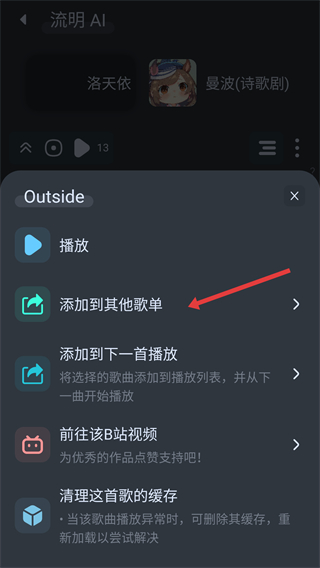 3、選擇歌曲后會(huì)彈出操作選項(xiàng),可點(diǎn)擊添加到其他歌單將歌曲歸類到不同歌單方便管理和查找。