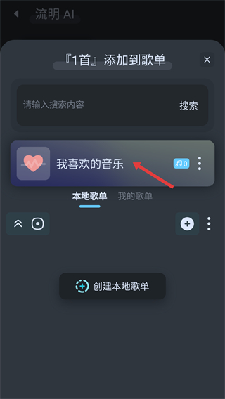 4、在添加到歌單頁面可搜索歌單,也能選擇我喜歡的音樂歌單,還能創(chuàng)建本地歌單更好地整理收藏的音樂。