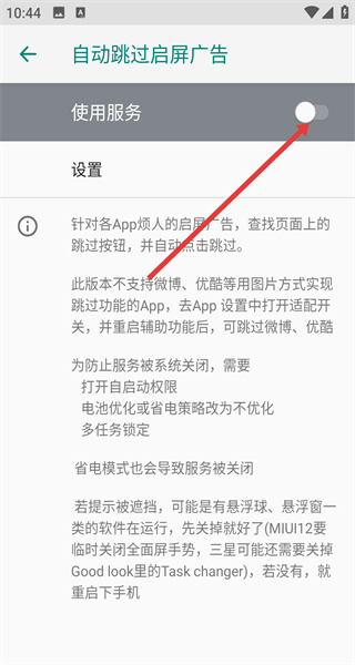 3、在自動跳過啟屏廣告設置頁面,找到使用服務的開關按鈕,點擊該按鈕將其開啟。