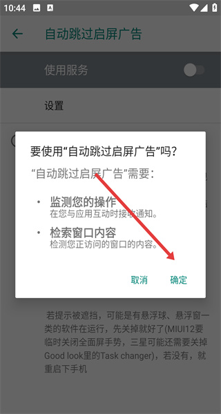 4、開啟使用服務后,會彈出是否使用自動跳過啟屏廣告的確認彈窗,點擊確定按鈕,完成該功能的啟用設置。