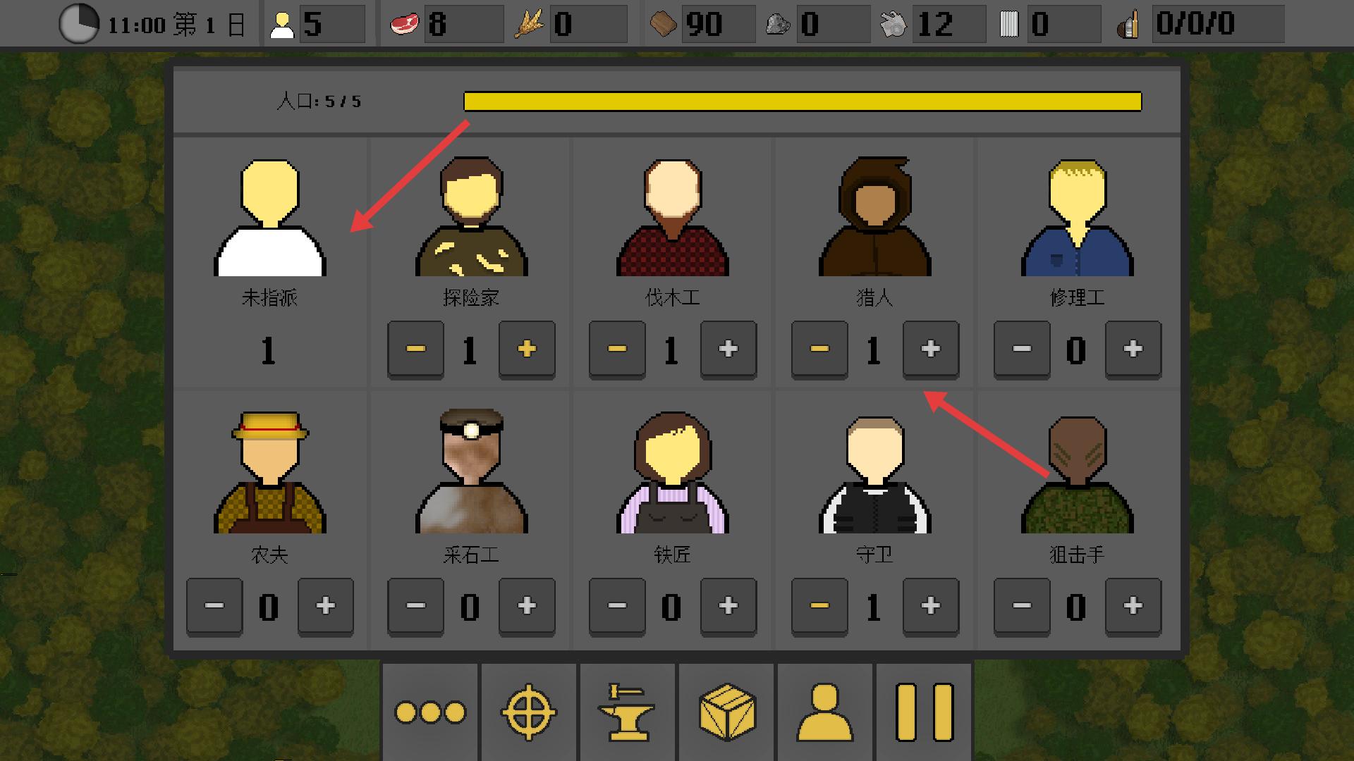 4、管理營地的人口,為不同角色分配職業(yè),如探險家、伐木工等,讓他們各司其職,推動營地的發(fā)展和壯大。