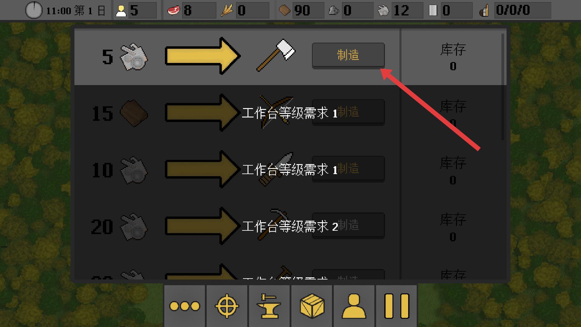 3、在制造界面,收集所需材料,制造工具和設(shè)備,提升營地的生產(chǎn)和生存能力,滿足營地的各種需求。