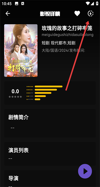 3、在想要下載的電視劇影視詳情界面,點(diǎn)擊屏幕右上角帶有箭頭指向的設(shè)置類(lèi)圖標(biāo)即可喚起下載選項(xiàng)欄。