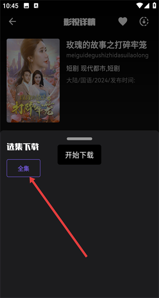 4、下載選項(xiàng)欄彈出后點(diǎn)擊全集按鈕選中全集即刻開(kāi)始下載,緩存該短劇內(nèi)容方便離線觀看與回顧重溫。