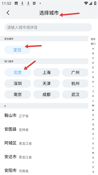 1、在選擇城市頁面可通過定位按鈕快速定位所在城市,也能點(diǎn)擊熱門城市如北京,上海等直接選擇還可在搜索框輸入城市或拼音查找。