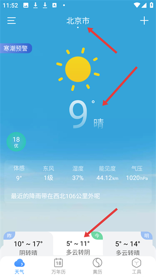 2、選定城市后進(jìn)入天氣頁面能查看當(dāng)前溫度,天氣狀況還有體感,風(fēng)向,濕度等詳細(xì)信息以及未來幾天的天氣趨勢。