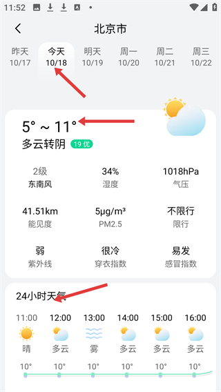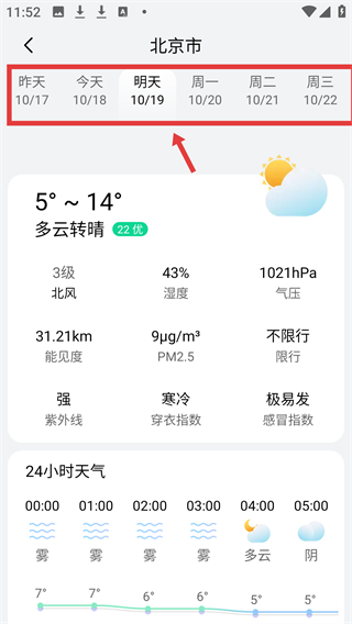 4、在日期選擇欄切換不同日期能查看未來幾天的天氣情況,了解溫度變化天氣類型還有紫外線,穿衣指數(shù)等實(shí)用信息。