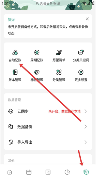 1、在我的主頁在拉,找到功能頁點擊自動記賬進入自動記賬設(shè)置界面,即可開啟設(shè)置自動記賬功能。