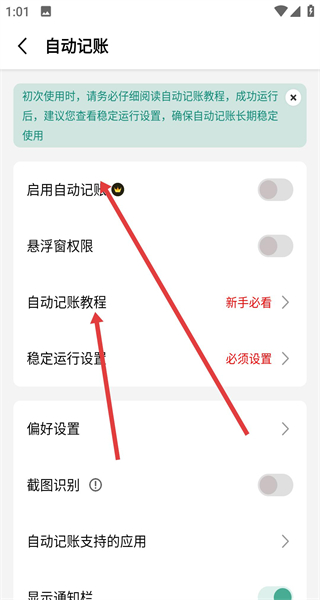 2、在自動記賬頁點擊啟用自動記賬的開關(guān)按指引操作進行下一步操作,遇到困難也可以返回點擊自動記賬教程學(xué)習(xí)。