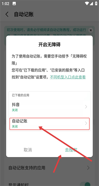 3、點擊啟用自動記賬的開關(guān)后會跳出開啟無障礙彈窗,選擇自己想自動記賬的應(yīng)用,點擊去授權(quán)完成權(quán)限授予。