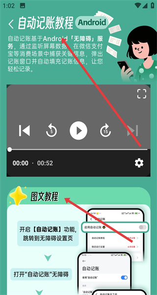 4、進入自動記賬教程頁,可點擊觀看視頻或點圖文教程依步驟學(xué)習(xí)開啟自動記賬及權(quán)限設(shè)置。
