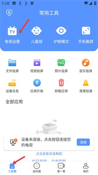 2、打開工具箱能看到常用工具如電視設(shè)置兒童鎖等,還有文件投屏,視頻投屏等功能若設(shè)備未連接可點(diǎn)擊連接按鈕連接電視。