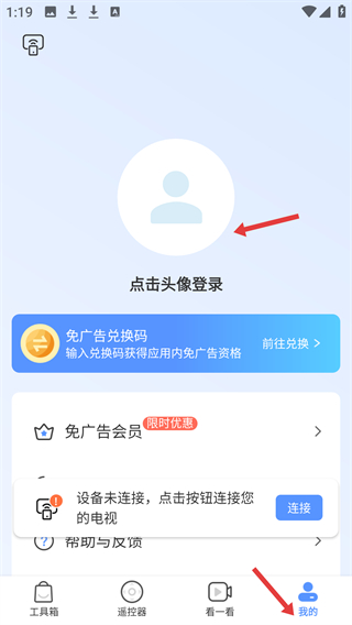 1、進(jìn)入我的頁面可點(diǎn)擊頭像登錄賬號(hào)還能使用免廣告兌換碼,前往兌換免廣告資格也可查看設(shè)備連接狀態(tài)進(jìn)行電視連接操作。