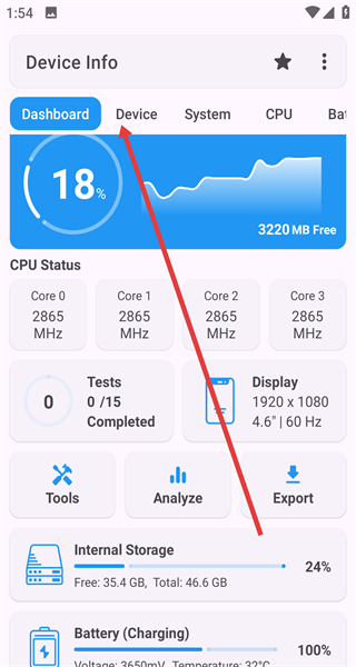 1、打開Device Info應(yīng)用在Dashboard頁點(diǎn)擊Device選項(xiàng),即可查看設(shè)備的制造商型號(hào)等基礎(chǔ)信息。