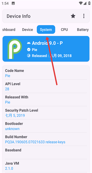 3、點(diǎn)擊屏幕上方的System按鈕,切換到System頁面可以查看系統(tǒng)版本Android9.0,API Level和安全補(bǔ)丁等系統(tǒng)參數(shù)。