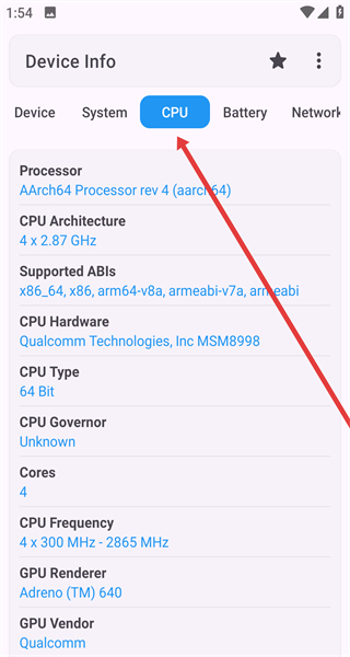 4、點(diǎn)擊進(jìn)入CPU頁面能夠查看到處理器架構(gòu)核心數(shù)和頻率等CPU硬件信息,能夠更多的了解到設(shè)備的性能。