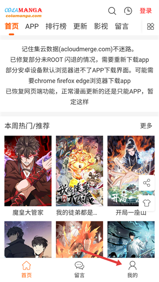 1、進入首頁可看到本周熱門推薦漫畫,若要登錄賬號點擊右下角我的進入登錄相關(guān)頁面。