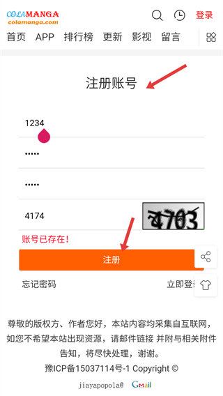 3、注冊賬號時依次填寫相關(guān)信息,輸入驗證碼確認(rèn)無誤后點擊注冊,若提示賬號已存在可選擇立即登錄或更換賬號注冊。