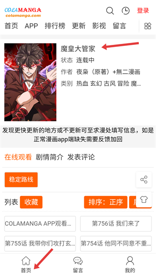 4、登錄或注冊完成后可在首頁選擇喜歡的漫畫,如魔皇大管家進入其詳情頁能查看狀態(tài),作者,類別等信息也可在線觀看發(fā)表評論。